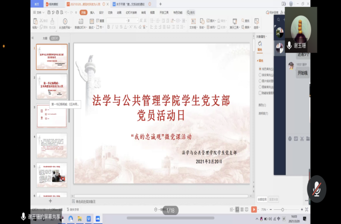 为深入贯彻自治区党委组织部《关于加强对党忠诚教育的意见》文件精神,强化党员政治品质,2021年3月20日,法学与公共管理学院学生党支部采取腾讯会议线上学习的形式,开展“我的忠诚观”微党课——学习第一书记杨明威的驻村扶贫事迹,党课由谢玉珊同志讲述,支部全体成员参与学习。