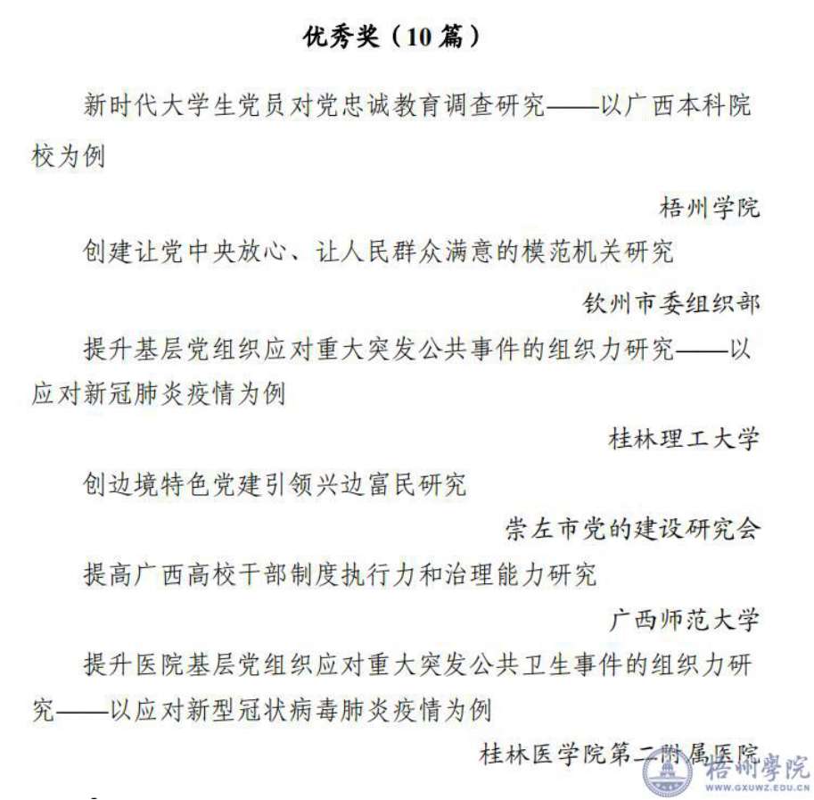 近日,由我校冀宁、廖壮欢、许丽娟、覃春丽、莫伍珠撰写的《新时代大学生党员对党忠诚教育调查研究——以广西本科院校为例》获广西党的建设研究会2020年度重点课题优秀奖,在30篇获奖课题中仅有4所高校的调研成果获得通报表扬。在全区2020年“党课开讲啦”暨党员教育“八桂先锋”优秀作品 (课件)评比中,我校推送的党课视频《俯首甘为孺子牛,俊德高风励后人》获优秀奖,本次共有200部优秀作品获得通报表扬,其中仅有3所高校作品入围。