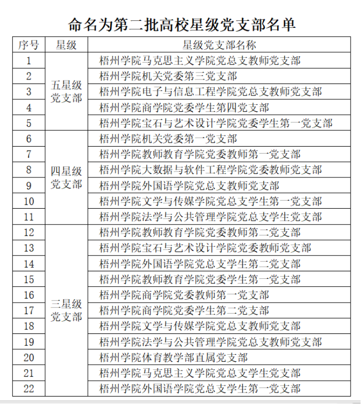 近日,自治区教育工委公布第二批命名为高校星级党支部名单,我校共有22个党支部被命名,其中,马克思主义学院党总支教师党支部等5个党支部被命名为五星级党支部,机关党委第一党支部等6个党支部被命名为四星级党支部,教师教育学院党委教师第二党支部等11个党支部被命名为三星级党支部。