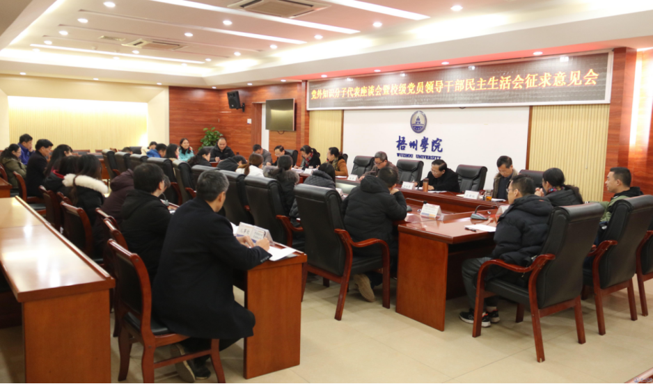 为开好2020年校级党员领导干部民主生活会,1月12日至13日,校党委书记韦仕珍、党委副书记曹迎分别主持召开专题民主生活会系列征求意见座谈会,广泛征求高层次人才代表、中层干部代表、党外知识分子代表、教职工代表、学生代表的意见和建议,学校领导班子成员参加了有关座谈会。