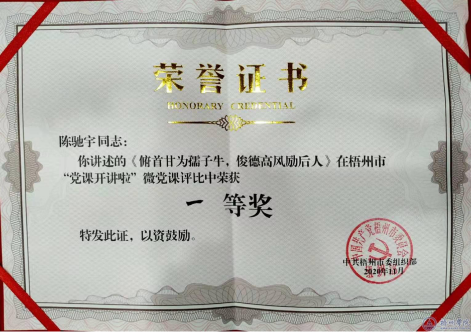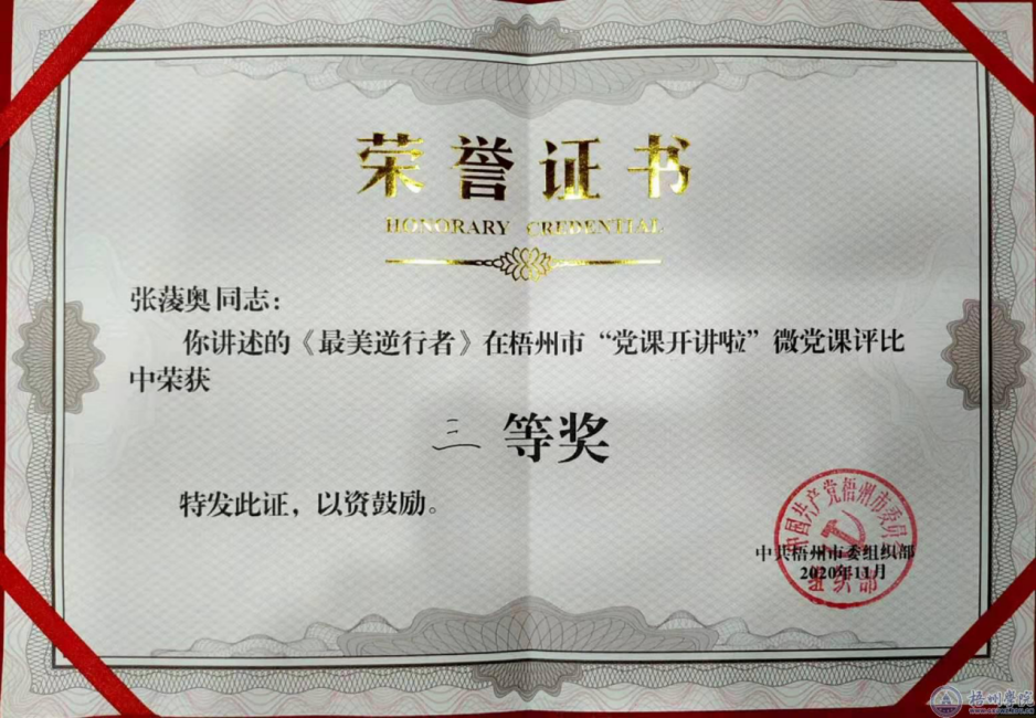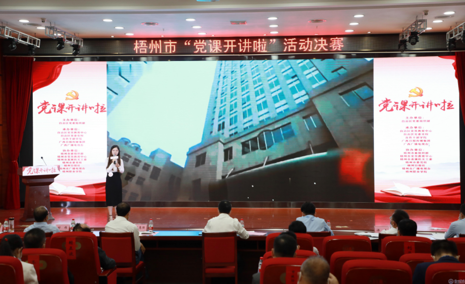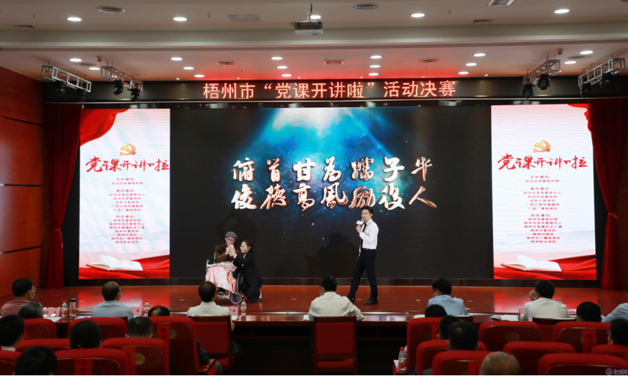 11月17日上午,梧州市“党课开讲啦”活动决赛在梧州职业学院举行,来自全市各基层党组织的优秀党课讲师齐聚一堂,以微党课的形式作精彩讲述,交流碰撞思想的火花。我校选派的陈驰宇和张蔆奥两位党员教师以出色的表现在众多选手中脱颖而出,分别荣获一等奖和三等奖。