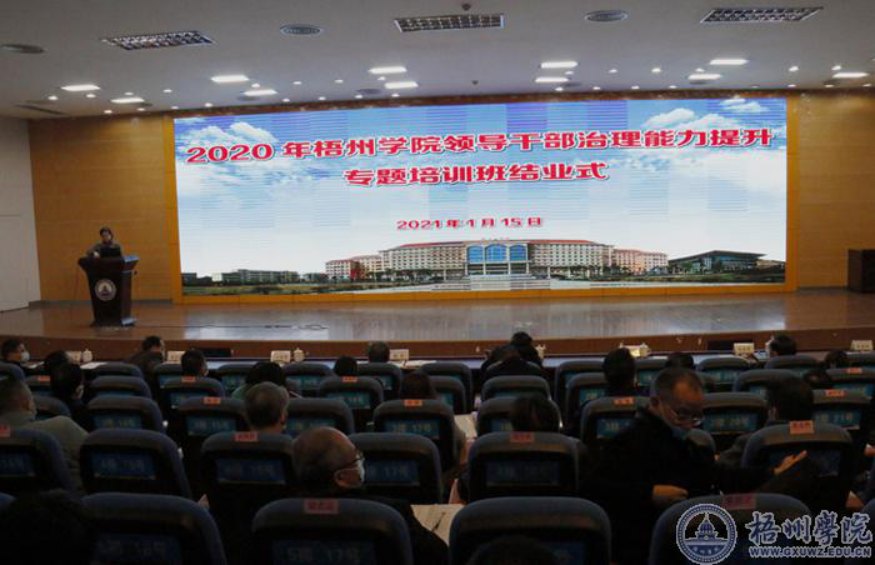 1月15日上午,我校在明理楼一楼学术报告厅举办2020年梧州学院领导干部治理能力提升专题培训班结业仪式。学校全体校领导出席会议,全体中层领导干部、科级干部、专职组织员参加会议。会议由校党委副书记曹迎主持。